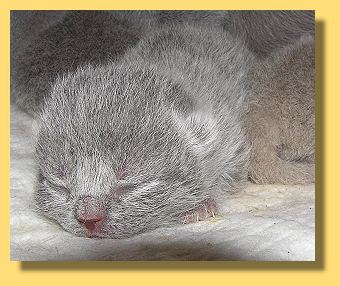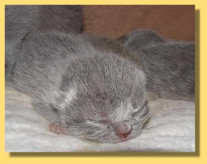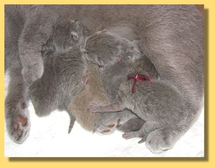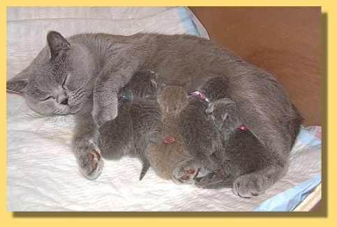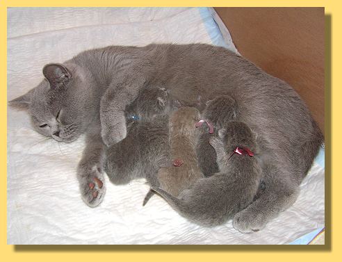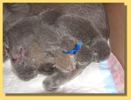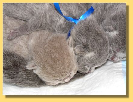 Wir sind wirklich glücklich und mindestens eben so dankbar, dass alles so problemlos verlaufen ist! Am 30.09.2009 hat unsere süße Betty sage und schreibe f ü n f wünderschönen und sehr propperen Babys das Leben geschenkt. Innerhalb einer halben Stunde kamen ihre ersten drei Kinder und nach einer Erholungspause noch weitere zwei. Ganz selbstverständlich hat sie, wie es eigentlich unsere Mütter immer machen, die angebotene Wurfbox angenommen. Sie kümmert sich sehr instinktsicher und mit großer Hingabe um ihren Wurf. Wie wir es gehofft hatten, scheint die Verpaarung mit Tom-Tom gut gepaßt zu haben; denn wir finden die Welpen augenscheinlich echt klasse. Zu meiner großen Überraschung und auch Freude, tragen beide das chocolate Gen ... so ist auch ein lilac Baby dabei. Betty ist eine super, super tolle und fürsorgliche Mutter. Wir sind sehr froh, dass wir ihr die Gelegenheit dazu geben konnten.