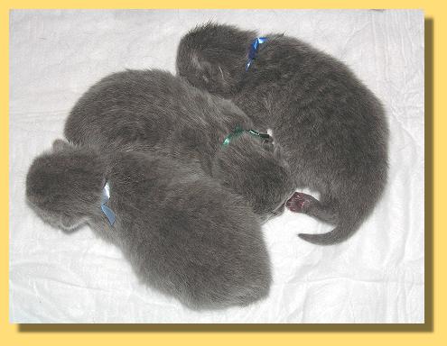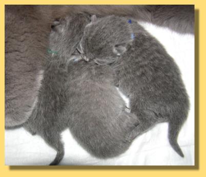 Wir sind überglücklich die Geburt unserer M-Babys nach Champion OrangeBlue Huckelberry´s Anjuli & Int. Ch. Kerelche van M&M, bekannt geben zu dürfen. In einer völlig unkomplizierten Geburt hat Anjuli gestern in der Zeit von 10.23 Uhr bis 11.50 Uhr DREI zauberhaften kleinen Blaubärchen das Leben geschenkt! Der Mama und den Babys geht es sehr gut! Anjuli ist, wie in jeder Lebenslage, die Ruhe in Person und kümmert sich mit einer Selbstverständlichkeit um die Kleinen, als hätte sie nie etwas Anderes getan - einfach wundervoll, diese Katze!